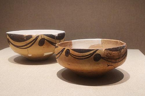 庙底沟文化彩陶一般都是在土黄色的陶器上直接用黑彩彩绘,也有少数先在陶器上装饰一层白色陶衣的。白色的陶衣经过检测,主要成分是石膏或者方解石。