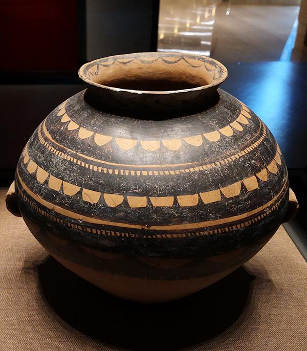 马家窑文化开始流行红彩,这打破了庙底沟文化黑白二彩的格局,而即使是黑彩,马家窑文化黑彩的原料也发生了变化。庙底沟文化的黑彩颜料为含有锰、铁的矿物质,而马家窑文化的黑彩则采用了辛铁矿。这件腹耳壶外壁施黑彩,颈部则是在黑色的地上装饰两道红彩折线纹。腹部采用红黑二彩描绘出瓜棱状纹饰,纹饰内填充有折线纹和印戳纹。在陶壶的颈部和腹部均有一对小耳,具有对称美感。