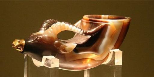 在西亚地区,早期的来通基本呈现短而圆的圆锥形,以巴格达伊拉克博物馆藏的陶来通为典型,其兽首除了羊首之外,牛首、马首、狮首也常有出现,至于饮用方式则正是从来通底部的小孔注入饮者口中。当时人们相信这种来通角杯是圣物,用它注酒能防止中毒,而如果举起来通一饮而尽,则是对酒神致以最高敬意。圆锥形的来通有一个致命的弱点,口大底小,杯身平直,不方便放置,总不能始终用手端着吧?于是聪明的古波斯人对其外形逐步进行了改造。