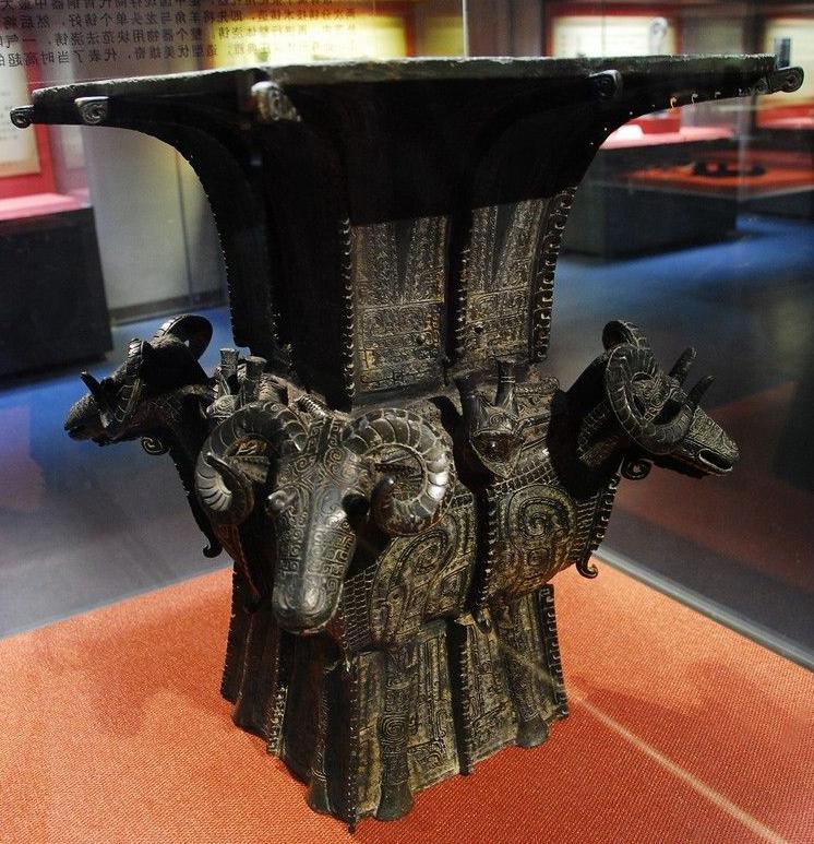 最具代表性的青铜器——四羊方尊的特点是:将羊形态融入器身中,采用借腹或借足的手法,与中原的要么羊头要么整只羊的做法不同。既保留了原始的图腾崇拜,又有替代羊作为牺牲献祭给神明的意思,同时还包含了对羊等家畜养殖兴旺的期盼,也可能萌芽了后世关于羊的种种观念。