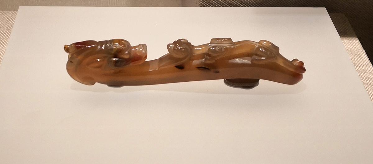 带钩的造型很别致,一条大龙背着一条小龙。寓意回头教子。