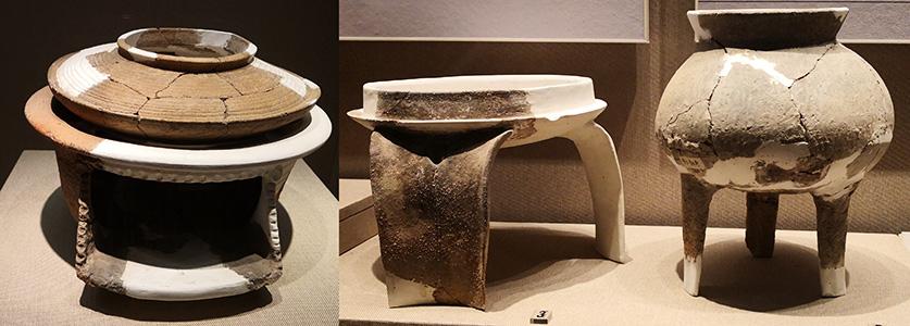 陶灶(左)扁足陶盘鼎(中)陶鼎(右)