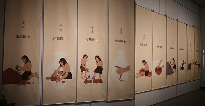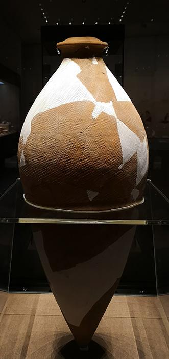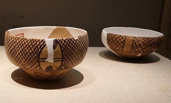 还有人猜测是当暖水瓶用。理由是,当时的地穴房屋内有灶坑和保存火种的砂陶罐,如果将尖底瓶插入灶坑内燃烧后的灰烬里,可以起到保温的作用。这样即使冬天也能随时喝到热水。听起来很有道理,不过,尖底瓶大多出自墓葬,没有在人们居住的地方发现过,所以也没法证明。本次展览的庙底沟陶器均来自遗址内的陶窑区(馒头窑),还没有经过使用,用途不明。而且多碎片,经过几年的拼接,才还原其外貌。