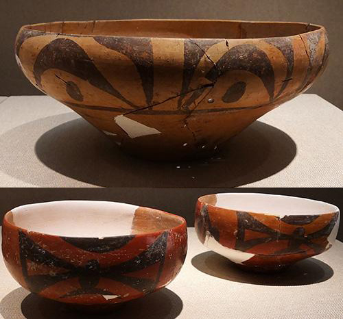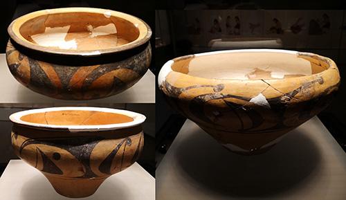 花卉纹彩陶盆(左上、左下)花卉纹彩陶钵(右)