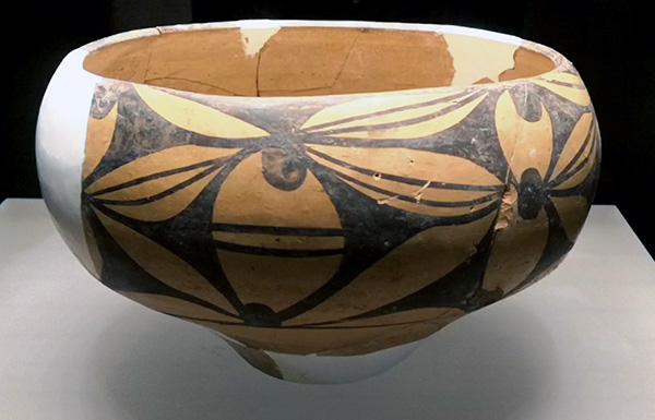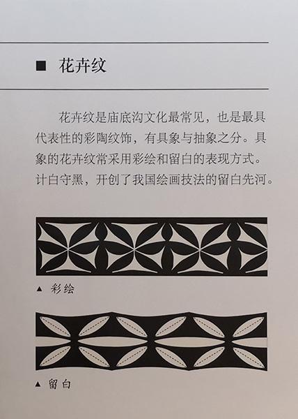 通过留白的方式表现花纹。黑地白花,而且花有5片花瓣,根据研究,庙底沟彩陶上的花卉多为菊科、蔷薇科。