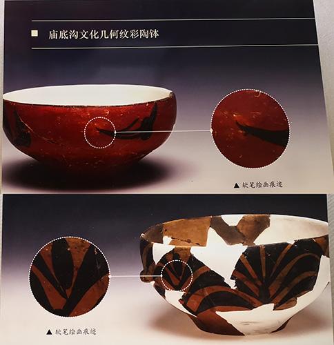半坡文化彩陶以线性图案为主,线条生硬。庙底沟文化彩陶多以弧线、弧边三角等为主,线条流畅,甚至在收笔之处,可以观察到明显的笔锋痕迹。这种变化说明庙底沟文化彩陶的制作采用了软笔,很可能是用狼、鹿之类的毛制成,说不定是中国毛笔的起源。