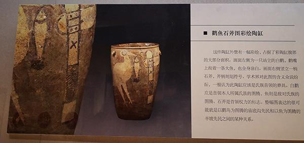 这件陶缸上的彩绘纹饰很有特点。石斧和鱼,用黑色线条勾勒轮廓、石斧上的孔眼、符号和紧缠的绳都进行了细致的描绘。鹳则直接用色彩涂染形体,惟有眼睛,用浓重的黑线勾圈,中间用黑色圆点表现眼睛,显得分外有神。这幅作品已经孕育了中国绘画传统艺术表现手法的两种基本形式──勾勒和没骨。可见这个陶缸应该是一件非常重要的礼器。现藏于中国历史博物馆。