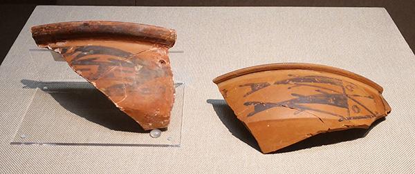 残片的胎体施以赭红色,这是三氧化二铁在高温下生成的颜色,其来源是赤铁矿的风化物——赭石,或者含铁量很高的红黏土。它们在自然界中较多见,容易获取,所以红彩是主要选择。