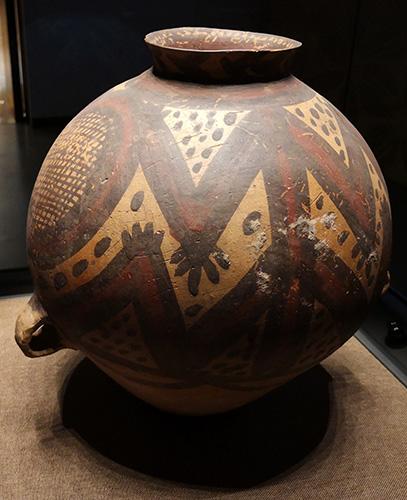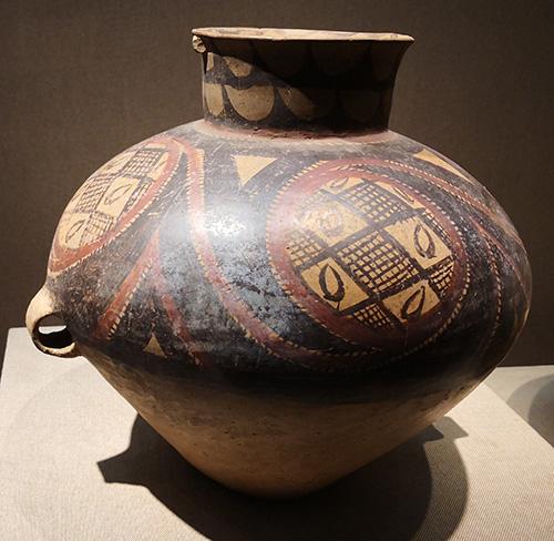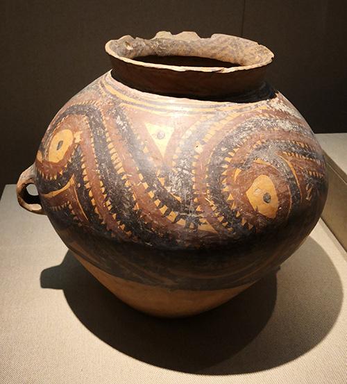 这件漩涡纹彩陶罐看上去造型有些怪异,就像是件残次品。但是经过分析,它很可能是特意这样设计的。理由有两个:第一,如果是残次品,上面的纹饰应该会有折痕或断裂,但是我们看到它的漩涡纹除了两边不对称,一大一小之外,线条连续,纹饰清晰;第二,它有三个耳,与普通的陶罐、陶瓮对称的两耳或四耳不同,可以想象,如果三只耳上都穿上细绳,那么这件陶罐的口就会倾斜,只需轻轻拉动中间那根绳,里面的液体就会倒出来。在还没有“流”(类似壶嘴)的时代,这样的造型也许正是为了方便倒水而刻意设计的。