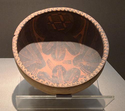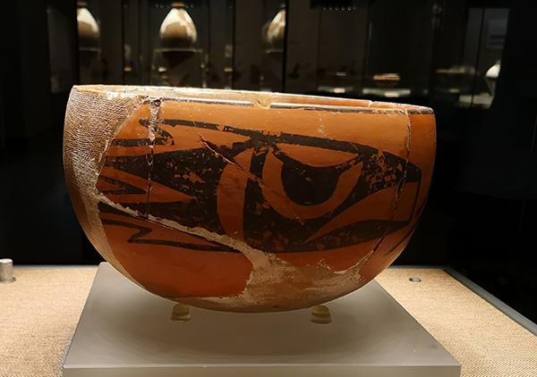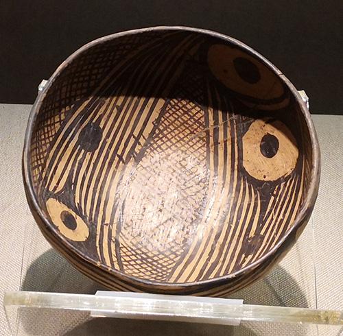 除了花卉纹之外,在有大量的几何纹。下图中的这件看上去像人的眼睛的彩陶钵,上半部分用竖条纹分割为数个单元格(方框形),每个单元格内用弧边三角、凸弧纹和圆点纹装饰。有学者称它为方框眼纹。另外一件上使用黑彩、圆点以及弯角状纹组成的图案,还被称为“西阴纹”,它们最早在西阴村遗址被发现。