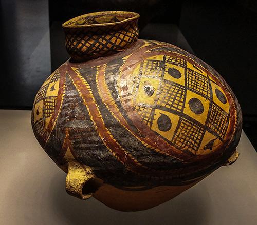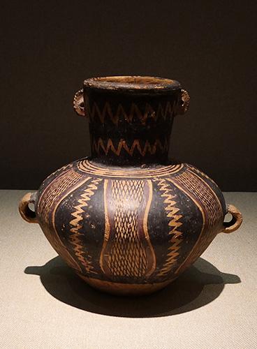 马家窑文化开始流行红彩,这打破了庙底沟文化黑白二彩的格局,而即使是黑彩,马家窑文化黑彩的原料也发生了变化。庙底沟文化的黑彩颜料为含有锰、铁的矿物质,而马家窑文化的黑彩则采用了辛铁矿。这件腹耳壶外壁施黑彩,颈部则是在黑色的地上装饰两道红彩折线纹。腹部采用红黑二彩描绘出瓜棱状纹饰,纹饰内填充有折线纹和印戳纹。在陶壶的颈部和腹部均有一对小耳,具有对称美感。