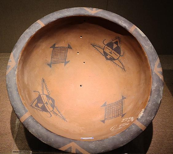 这件几何纹彩陶盆的内彩特别发达,图案的时代特点十分鲜明。由于是用于陪葬,所以绘制成内彩,使得主题花纹在俯视时一目了然。