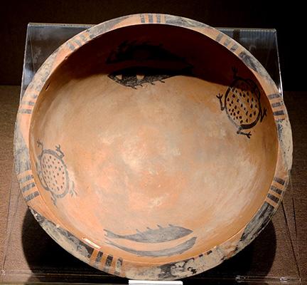 鱼纹的黑色,是以四氧化三铁为主要成分。不过黑色也分浓、淡,这其中的奥妙就在于锰的比例。锰的含量越高,颜色就越黑。当时的人们就是利用磁铁矿和黑锰矿来调配黑色的。有的看上去像棕色,实际上就是在黑彩颜料里加了红黏土,提高了铁含量的缘故。