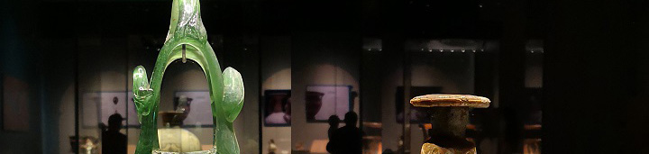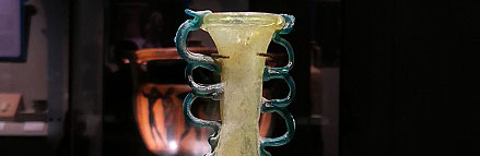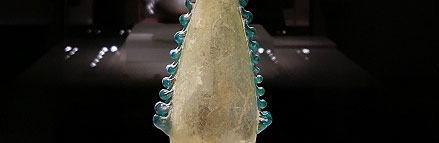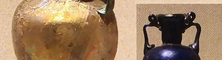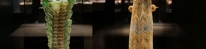公元前4世纪,埃及又发明了玻璃车花、镌刻、镀金等工艺。上图(左)是一件筒状精油容器。这样的香水瓶更多是用雪花石膏制成的。瓶身装饰羽状纹,应是将溶解后的有色玻璃缠绕在瓶上,趁未冷却用金属丝一类的器具向垂直方向平推制作而成。此外,玻璃常用于制作饰品、护身符等小件物品,或建筑外墙的装饰玻璃釉层。上图(右)是一件提梁瓶,其复杂的造型反映出工匠较高的技术水平。瓶口四角上端连有数层提梁,瓶身至底部附有波浪形纽带。这些造型需要在热加工中快速塑形,一旦玻璃凝固就难以改制了。