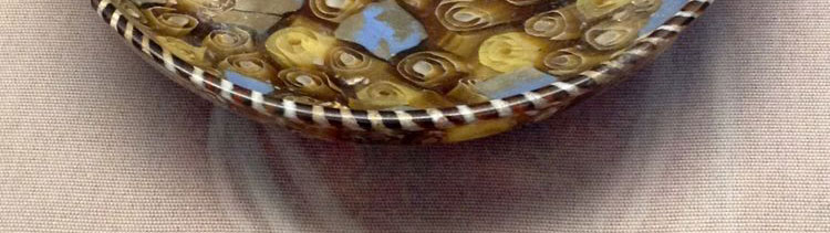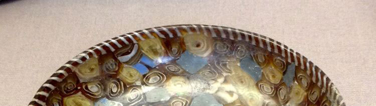 最珍贵的就是马赛克玻璃:上图玻璃盘内不规则图形是被切成碎片的玻璃。那些小漩涡是先把软化的玻璃卷起来,经过热熔形成一个玻璃小棍棍,再把小玻璃棍棍切成片,放进模具,然后高温加热让它们融为一体。