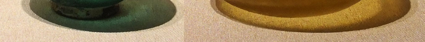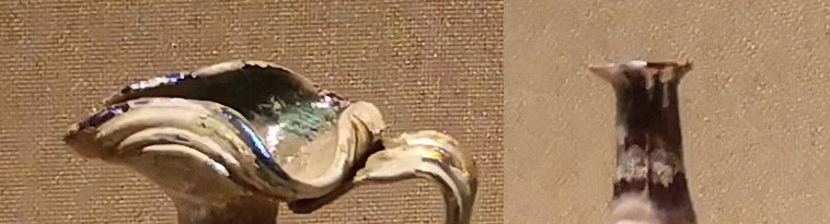 上图中的玻璃器皿都是吹制而成。水壶(左)的口部是三瓣式的花口,便于倾倒液体时把握流向。这种器型也称作奥伊诺丘(Oinochoe),希腊语中含有酒与倾倒的意思,曾影响我国隋唐时期的器物造型。这件水壶长期深埋土中,表面已出现银化现象,呈现出金属光泽。