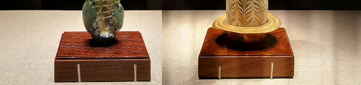 (右)这是一件盛放供品的玻璃钵。将加热后的黄色玻璃延展成圆板状,再倒置于钵的模具上,自然下垂成型。