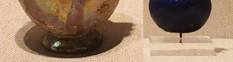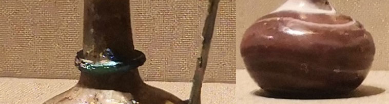 (右上)利用白色和紫色的玻璃构造出大理石的纹理。(右下)是用于盛放香油,口部扭曲成环状,既可以系绳便于携带,又增加了观赏性。