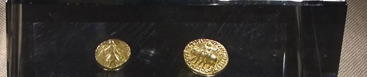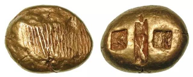 爱奥尼亚地区一种完全没有图案的圆形金币可能是最早使用的原始金币。这些金币通常正面只是粗糙的条纹,背面有凹进去的图形。按照我国著名钱币学家曾晨宇先生的说法,这些凹进去的图形是当时用作验证金币纯度的试金戳记。这种解释的可信度比较高,后世验金师也通常使用打戳的方式。这些戳记被后世带有图案的琥珀金币继承了下来。