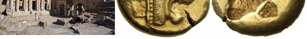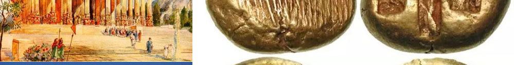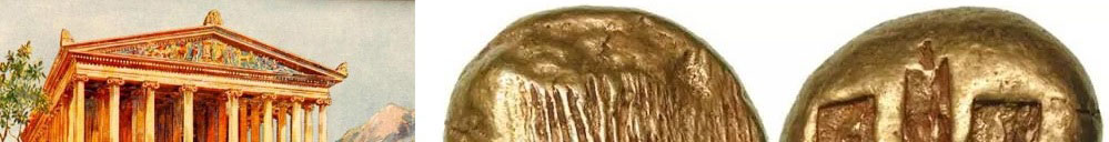 阿尔忒弥斯神庙油画(左上)、阿尔忒弥斯神庙(左下)、吕底亚金币(右上)、其他城邦的金币(右下)