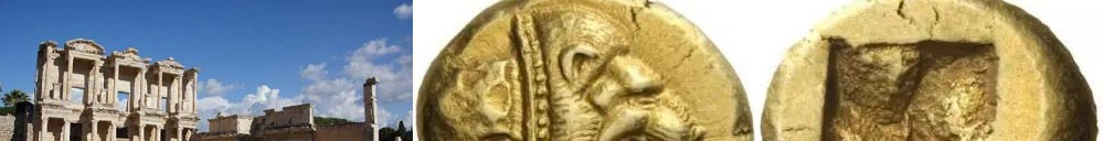 目前最早的钱币通常被认为来自今天土耳其西部的吕底亚城邦,那里是一个农业发达并且盛产优质马匹的地方。大约在公元前660年前后,开始铸造一种正面带有狮子头像的金币(右上)。考古学家们在以弗所的阿尔忒弥斯神庙(Artemision)发现了一批琥珀金币(ELECTRUM,金银合金,含银约20%),来自附近的帕克托勒斯(PACTOLUS)河和矿井。一部分按照吕底亚国王的标准铸造,另一些是希腊城邦标准,比如米利都、提奥斯、佛卡亚等。考古学家判断,应该是一次宗教性奉献的埋藏。这种金币的用途可能是向神灵的贡献,或者当做主人对下人的赏赐。古代中国的金币使用方式主要有:祭祀、对大臣/功臣/寺庙的赏赐、压胜、丧葬等,几乎不用于流通。公元前6世纪中期以后,琥珀金停止铸造,逐渐被银币取代。