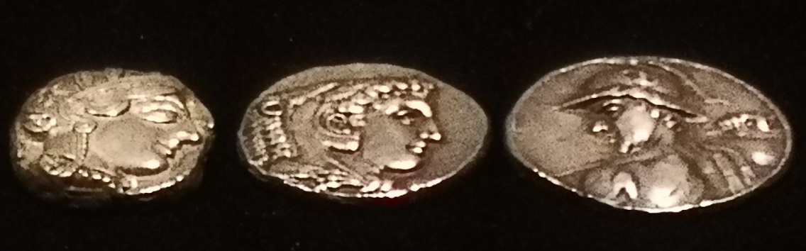 国王波塞冬像银币(左下,前185~前170年),巴尔赫(阿富汗)。希腊巴克特里亚王朝的安提马库斯·狄奥斯时期的四德拉克马银币。正面是戴圆形马其顿织帽的国王。背面是手持三叉戟的海神波塞冬。