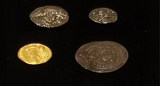 萨珊波斯沙普尔一世像金币(左下,公元241~272年),萨珊王朝第二代国王的第纳尔金币。正面带有球形装饰,刻头戴城壁冠的国王肖像,背面是琐罗亚斯德教的拜火坛和两位神官。