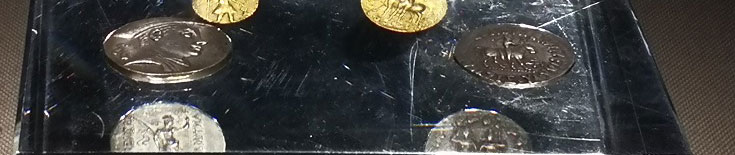 国王骑马像银币(右下,公元前1世纪),犍陀罗。印度塞西亚王朝阿吉利瑟斯(前57~前35年在位)的四德拉克马银币。塞西亚王朝为中亚游牧民族政权,击败孔雀王朝掌控犍陀罗地区。该时期的银币为国王全身像,游牧民族风格,携弓骑马,背面是持长枪的孪生神灵,宙斯之子狄俄斯库里兄弟。