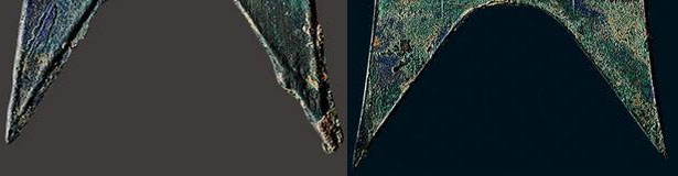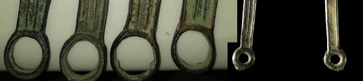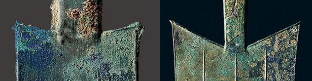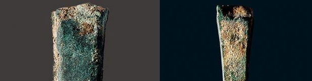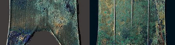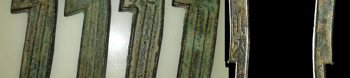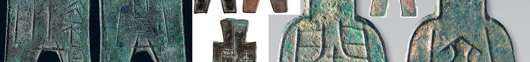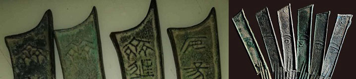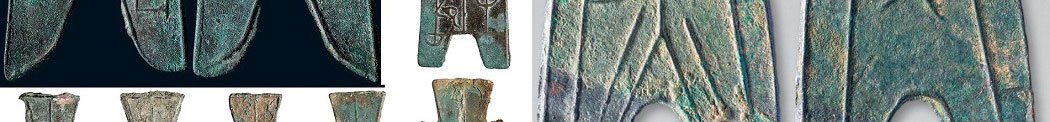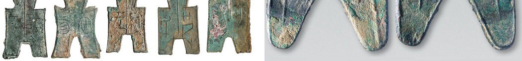 左侧空首布来自春秋时期的晋国,右侧耸肩尖足空首布,肩、足皆为尖角状,起源于生产工具“耒”。