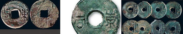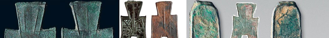 赵国尖足布币(左上)、方足布币(中)、圆足布币(右)