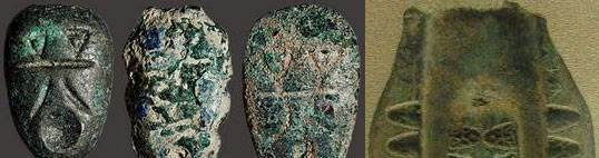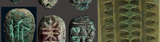 压印图案和文字的模具选用的是青铜合金(铜80%,锡20%),由面模和底模两部分,皆成圆柱形,直径与坯饼相同。底模常被固定在厚重的木桩上,相当于铁砧。预热好的坯饼放在底模上,面模对准坯饼表面,用很重的锤子敲击面模柱完成压印。连续压印会导致铜制模具温度过高,使得图纹变得模糊,所以要经常涂抹动物油脂降温。这一问题直到罗马时代改用低碳的优质铁模具后才得到改善。