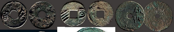 战国·王畿“西周”圜钱(左上,二级文物)、战国·王畿“东周”圜钱(左中,一级文物)、战国·齐“益六化”圆钱(左下)、战国·燕“明四”圆钱(中上)、东周国所铸圆形圆孔的圜钱(中)、战国“离石”圜钱(中下,山西离石境内)、战国“共”字圜钱(右上)、战国·魏 “垣”圜钱(右中)、秦半两(右下)