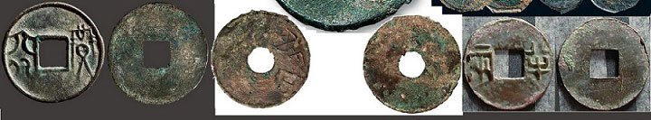 五铢钱(左上)、开元通宝(左下)、大观通宝(右上)、建炎通宝(右中,折三篆书)、秦半两(右下)