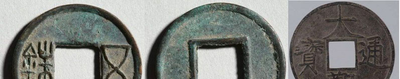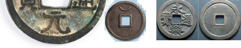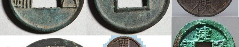 大观通宝是北宋徽宗赵佶在大观年间(公元1107年至1110年)所铸。建炎通宝是南宋高宗建炎元年(公元1127年)所铸,铸造量极少,钱文篆书、隶书成对,皆为古钱大珍。永乐通宝是大明王朝明成祖朱棣于永乐六年(1408年)开铸的年号钱。