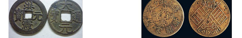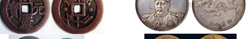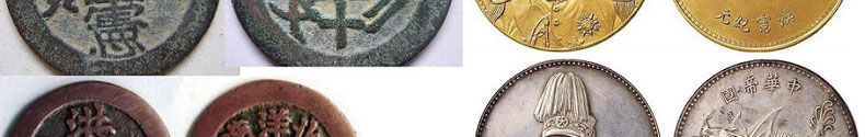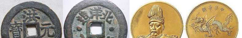 洪宪通宝(左)、洪宪金币(右上)、洪宪银币(右中)、洪宪铜币(右下)