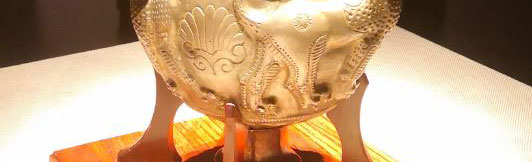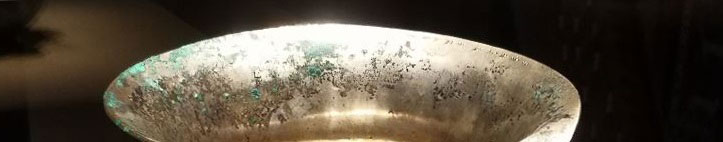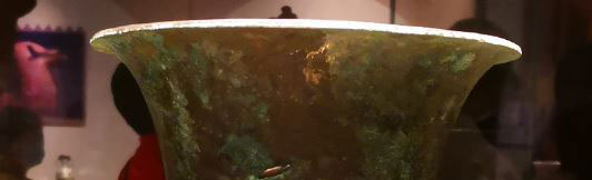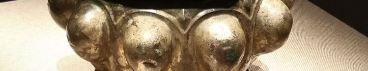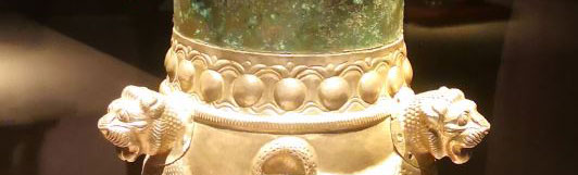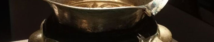 公元前7~前6世纪,伊朗。深腹铜杯外侧饰银板,银板上端刻一周石榴果实纹,下部饰狮子。狮子头部突出,有强烈的的立体感。