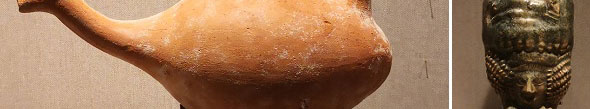 上图右侧的绿釉人面双炳来通,上部为双耳瓶,底部流口为山羊或鹿的头,肩部饰有手持杯子横躺的希腊英雄大力神赫拉克勒斯。下面还有一头戴冠带、两侧卷发的贵族头像。