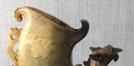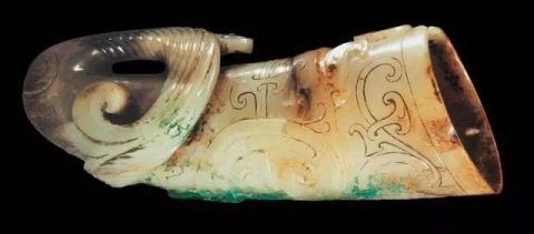 一整块青玉雕琢而成,呈犀牛角造型,口椭圆,腹中空。高18.4厘米,口径5.9-6.7厘米,口缘厚0.2厘米,重372.7克。列入《首批禁止出国(境) 展览文物目录》。