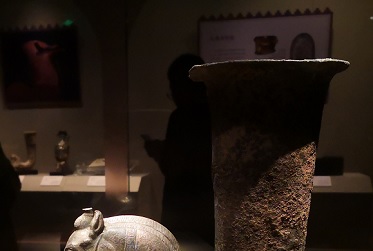 来自南意大利的红绘牛头形来通杯整体呈圆锥形,下半部是一头公牛,上半部分做成敞口的杯状。类似形状的器物在我国也有,称为“角杯”。我国最早可追溯至新石器时代的河南禹县谷水河遗址、曾经出土一只陶制的角杯。角杯有两个特点:其一,为兽角(或仿兽角)制成,其二,从口部饮用。动物制品实难保存,目前比较完整的典型器物来自战国、汉代、唐代。