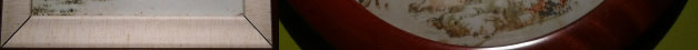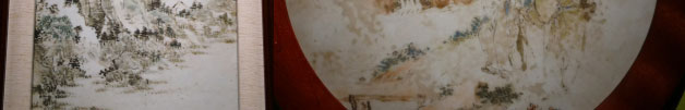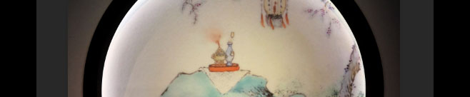 金品卿,名诰,字品卿,号寒峰山人、品卿居士,安徽黟县人。他擅长浅绛彩瓷山水、花鸟和人物画,设色清丽。后期转画粉彩,为景德镇晚清瓷画界的大家。上图(左)是一幅山水图,远处奇峰高耸,直入天际。中景描绘有草屋掩于树林之中。近景处小桥流水、灌木丛生,湖面微风轻拂,波光粼粼,呈现出一派优美的湖光山水之色。画面布局讲究,设色淡雅清新,充满情境。