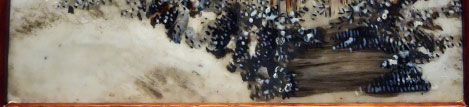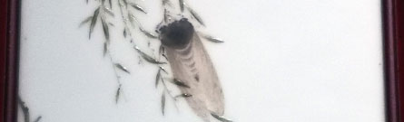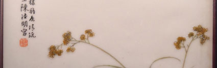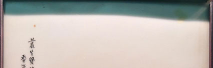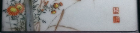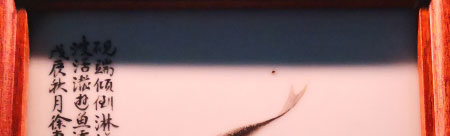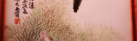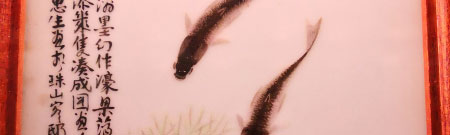 看见这件鱼藻图的瓷板,大家第一个会想到谁?对,珠山八友的邓碧珊。这件作品的作者徐惠生,师从邓碧珊,得其“画鱼不画水”的精华,两条墨色鲤鱼在水草间畅游觅食。鱼尾线条飘逸,配以水草摇曳,尽显悠然自在的生动景象。还有一条似乎翻白肚了……