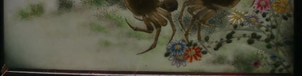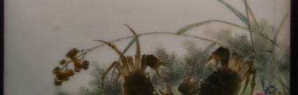 陈德明又名陈香生。是现代著名陶瓷艺术家余翰青的启蒙老师。擅长花鸟、虫草。其作品的特点是构图简单、线条流畅、画面生动形象,动感十足。两只横行霸道的螃蟹在浅滩上爬行,螃蟹身体用墨彩绘制,皴染技法使其身体富有质感,毛茸茸的大钳子褐彩洗染。螃蟹题材在明代就已经出现,但多为写意,民国景德镇瓷绘螃蟹多为写实,墨线的芦苇在微风吹动下摇曳。