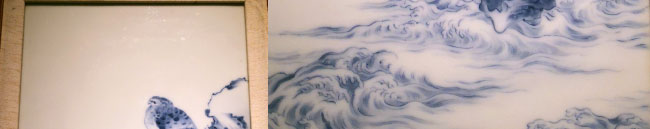 传统青花的分水划线法,即先分水出形象,后用工具划出白线,产生青白对比、虚实相生的效果。王步不局限先双钩纹样的轮廓,再在纹样内分水这一方法,而常用先分水的方法来塑造纹样的形象,再在纹样的必要部位用锋利的工具划出白线的表现手法。他称之为“分水勾线的没骨法”,比如作品中的海浪,用青花分水的专用工具——鸡头笔的笔锋牵引着料水在坯上运动。笔锋不触及坯体,料水会由坯体自然吸干,烧成后料色多漂翠,色面光泽度好。由于游离性物质渗入釉质,又形成了一些料晕。为了更好的将水墨画的浓淡在青花中表现出来,王步反复实验,掌握了料水积层的厚薄和运笔的规律,研制出能对应水墨五彩的青花五彩,丰富了青花的表现技法。