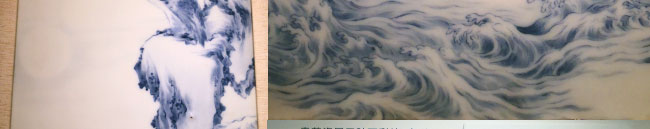 青花属于釉下彩,要在土坯上上色,然后入窑经高温烧成。上色的料线在坯上不透明,它的深浅是以积料的厚薄来达到的,在坯上不易辨别,只有经过高温烧成后才能显现出来。为此,在坯上要绘制出理想的青花作品,不仅要有过硬的画技,还要有丰富的分水经验和驾驭原材料特性的技能。这些都只是基本功。