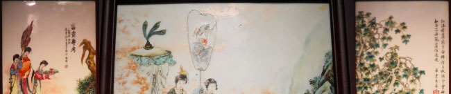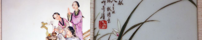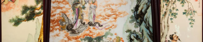 郭子仪遇仙的故事:唐代郭子仪是华州(今陕西华县)人,起初在沙漠边塞当兵驻防,后来因为京城催军饷,他奉命运送粮草,途中忽然起了风暴,没法向前走了,就躲进一间空屋里打了地铺住下。这天夜里,忽然房子左右一片红光,抬头看,只见空中有一辆华丽的车子慢慢降落下来,车上坐着一个美丽的女子,正俯身向下看。郭子仪急忙跪拜祝告说:“今天是七月初七,您一定是天上的织女降临了,请赐给我富贵和长寿吧!”仙女笑着说:“你能得到大富大贵,也能长寿的。”说罢,车子又慢慢升上天空。我们现在所看到的这两块瓷板就是定格在郭子仪遇见神仙的瞬间。