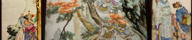 民国时期景德镇瓷绘人物故事题材中有一大批沿袭前代传统的仙道和传说人物、历史人物为主。如果是神仙人物、高士人物,画面多以博弈林间、坐卧观云、山涧引路、畅游河山等为主;如果是历史人物,多以孟母三迁、竹林七贤、周敦颐爱莲等“四爱”传统题材和闻鸡起舞、精忠报国、苏武牧羊等教育激励意义的题材。戏曲人物多以《封神演义》《三国演义》《杨家将》《西厢记》等之场景为主要表现对象。