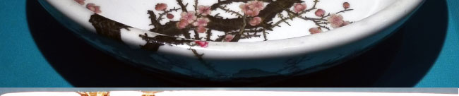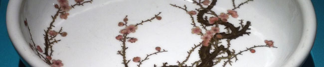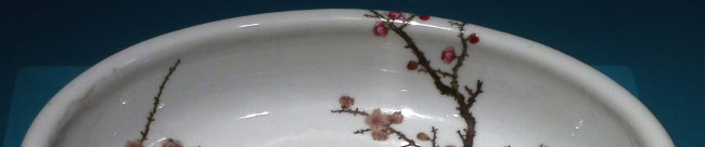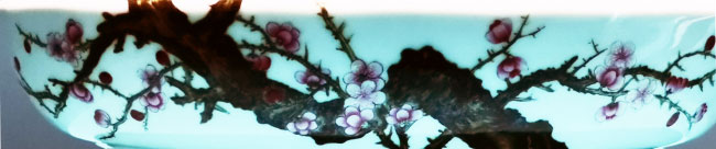 梅花树干苍劲,沿盘壁蜿蜒伸展至内壁。枝头梅花怒放。整体表现“一枝红杏出墙来”的意境。