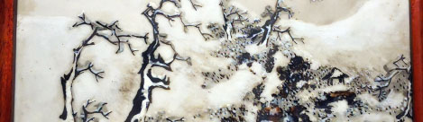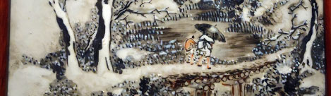 延续了何许人的雪景风格。漫天大雪中,一人头戴蓑笠,身背一人艰难前行。好在不远处就有茅屋、人家,可以驱走寒意。