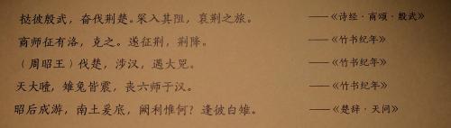 到周昭王时,则三次南征。《竹书纪年》记载,周昭王遭到“荆蛮”的强烈反抗,最后“南巡不返,卒于江上”。之后的周穆王、周宣王也从没放弃伐楚的政治路线。