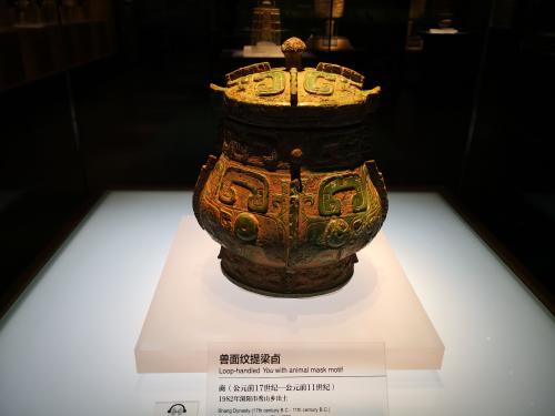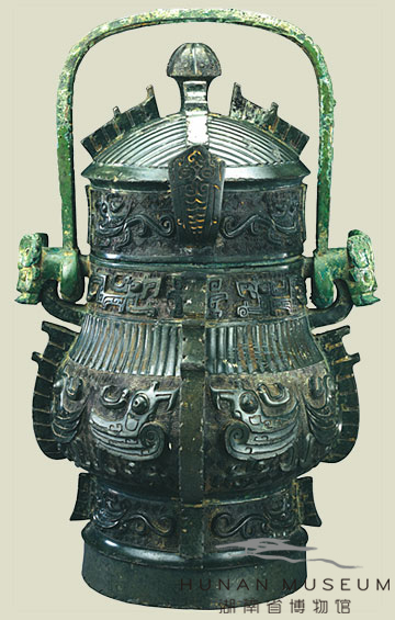 1971年浏阳县出土。腹部装饰一个兽面,占据了整个画面的三分之一。器物通体线条流畅而稳重大气,是一件十分难得的精品。卣是专用盛酒器,盛行于商周时期。只有在重大的祭祀活动中,才会使用。